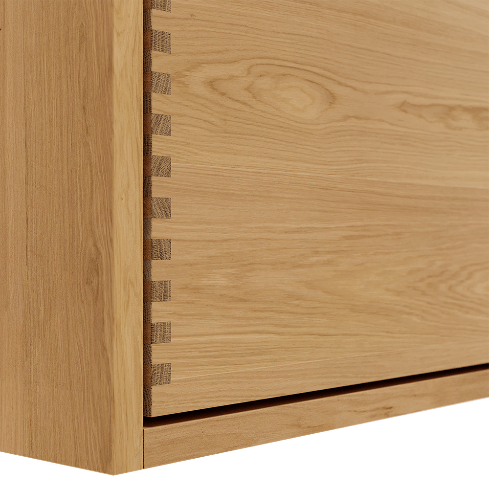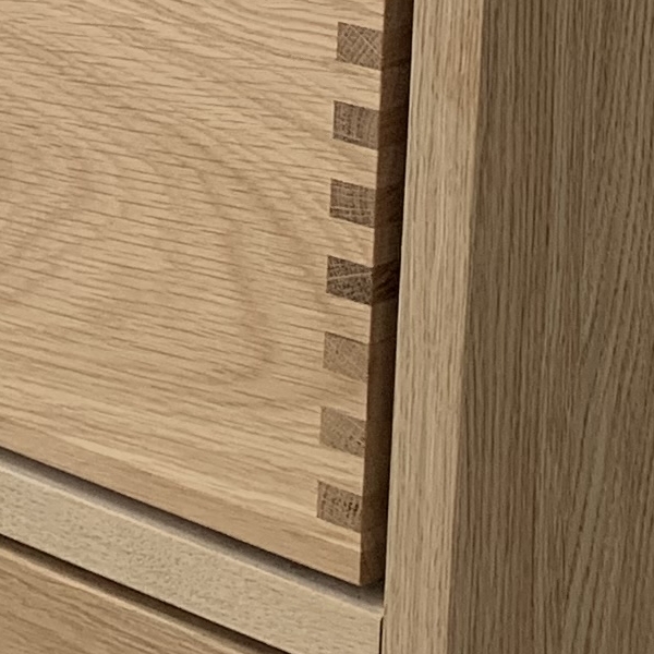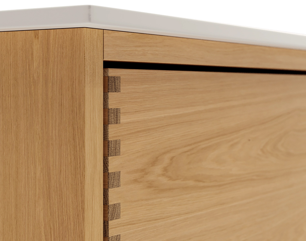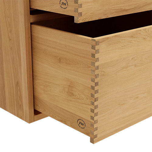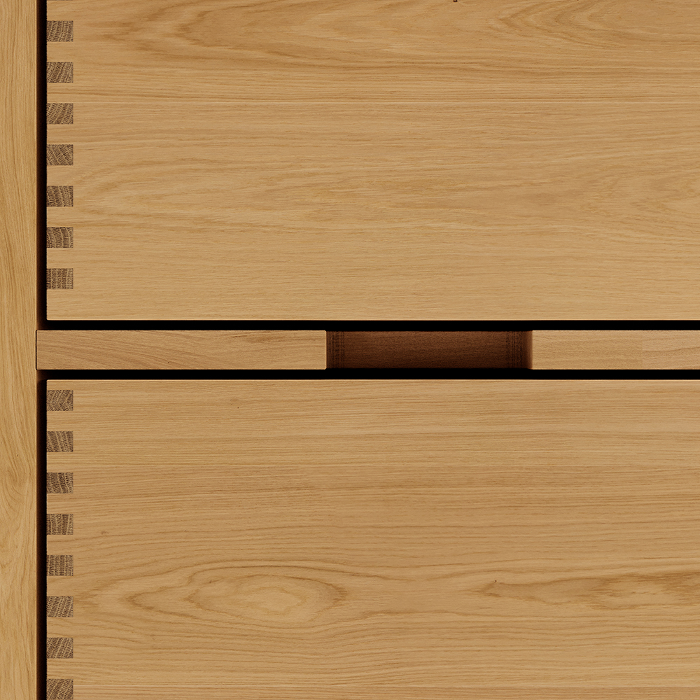 Et unikt snedkerprodukt lavet af de bedste materialer. Massive, olierede og fingertappede træskuffer i egetræ. Alle skuffer med fuldudtræk og softluk. Kraftig 8 mm. tyk bund og ekstra dybe skuffer der udnytter pladsen i skabet optimalt. Alt er lavet, så det passer perfekt sammen.