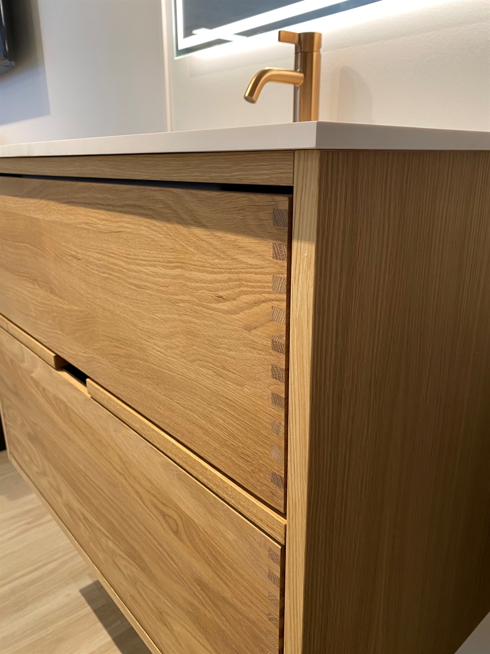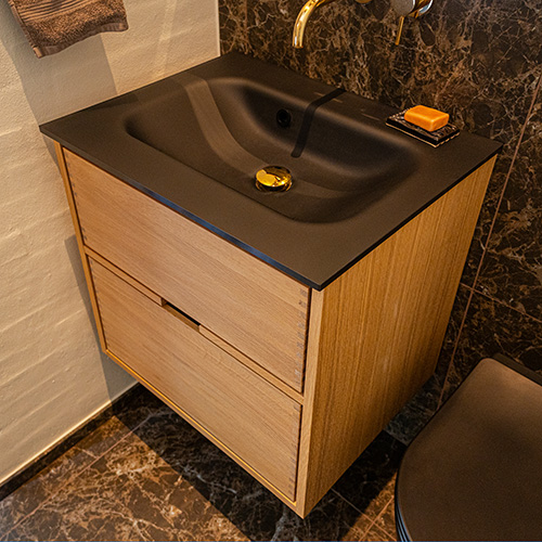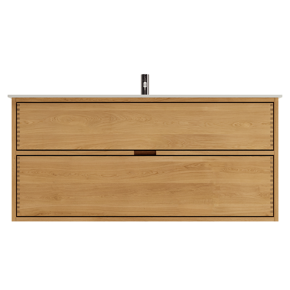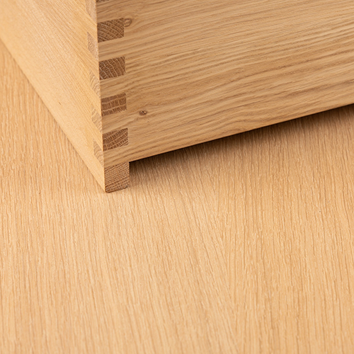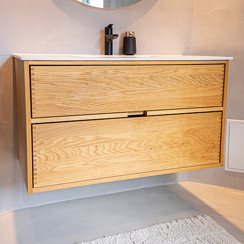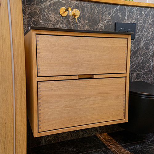 Et unikt snedkerprodukt lavet af de bedste materialer. Massive, olierede og fingertappede træskuffer i egetræ. Alle skuffer med fuldudtræk og softluk. Kraftig 8 mm. tyk bund og ekstra dybe skuffer der udnytter pladsen i skabet optimalt. Alt er lavet, så det passer perfekt sammen.
