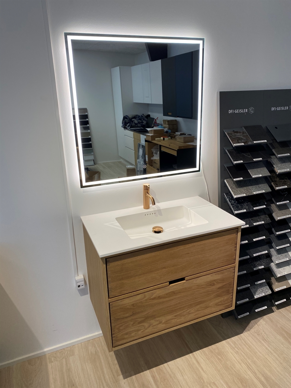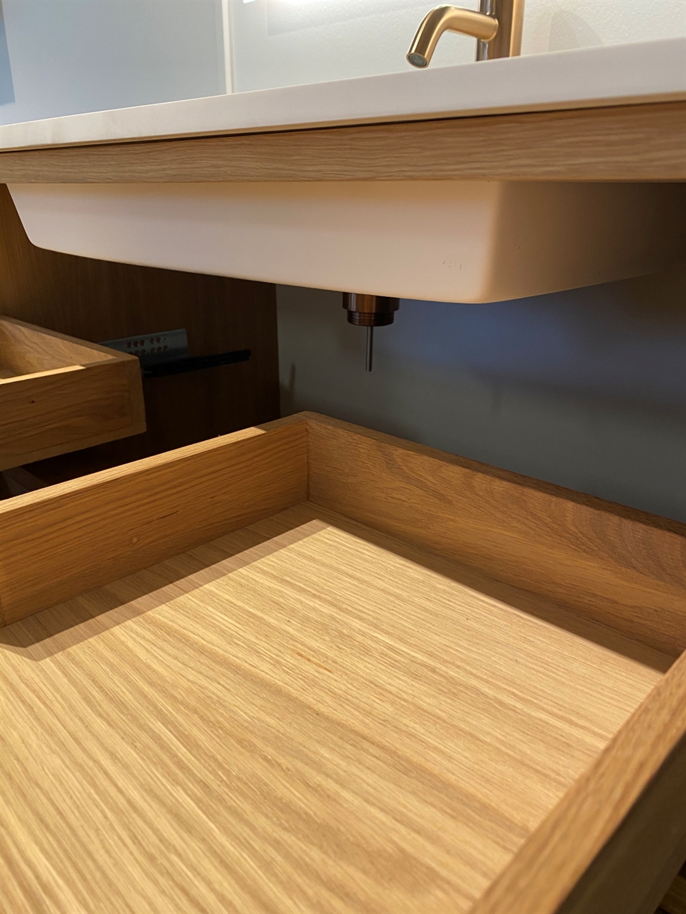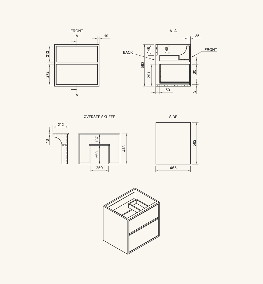 Der er 250x250mm udskæring i øverste skuffe til vask.