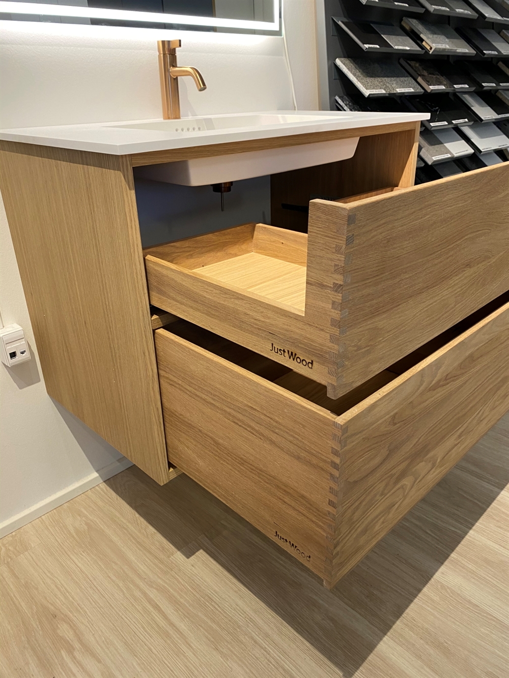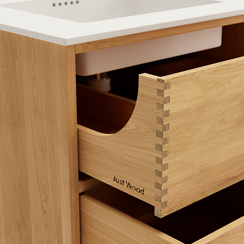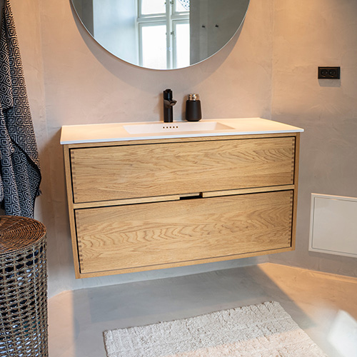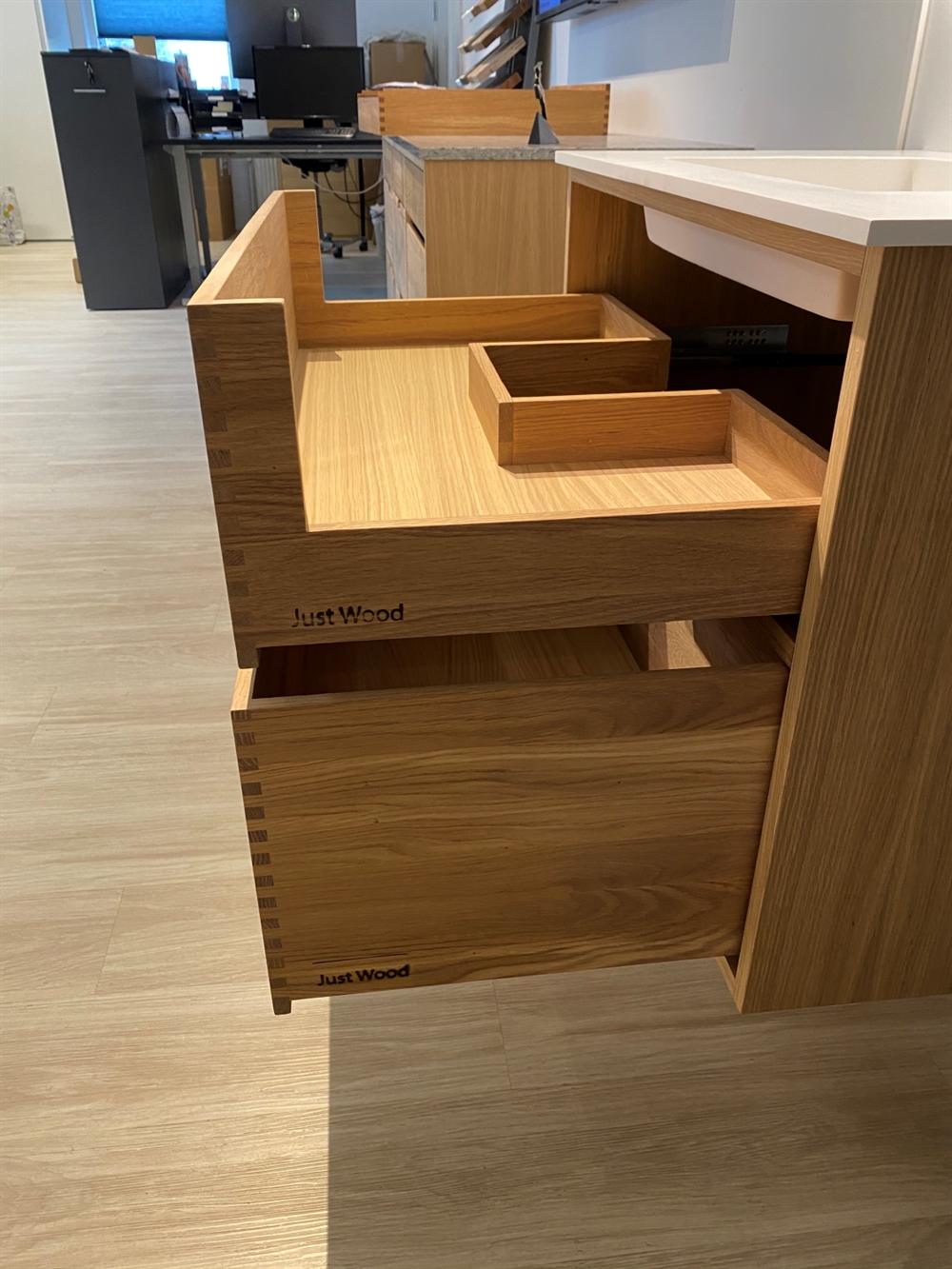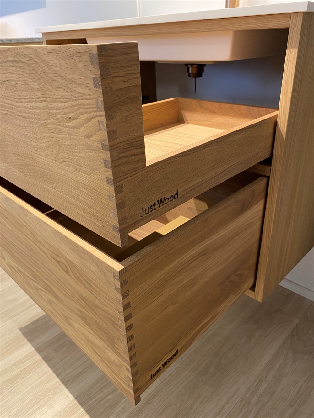 Just Wood er delvist danskproducerede elementer med massive fingertappede skuffer i egetræ. Vores møbler er hvidolieret fra fabrikken. Blandingsforhold er 1 del hvid og 5 dele klar olie fra Junckers.
