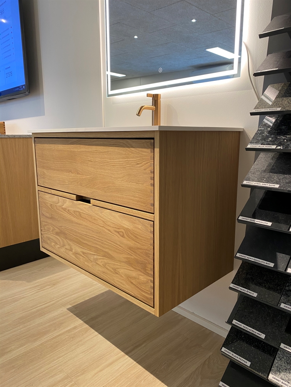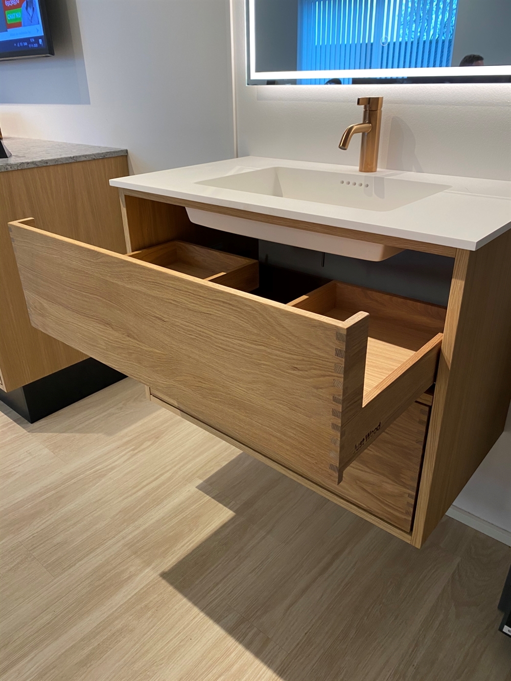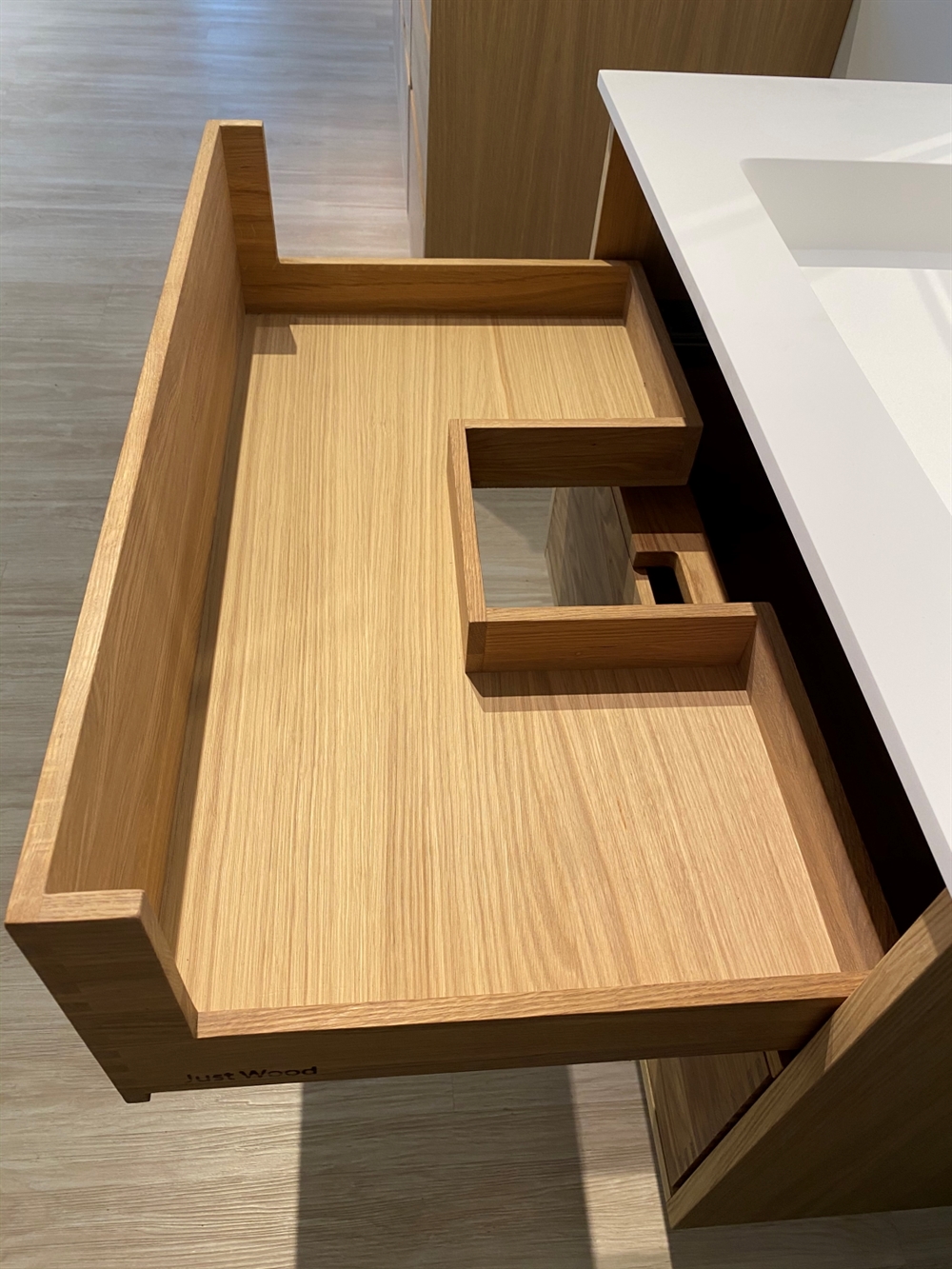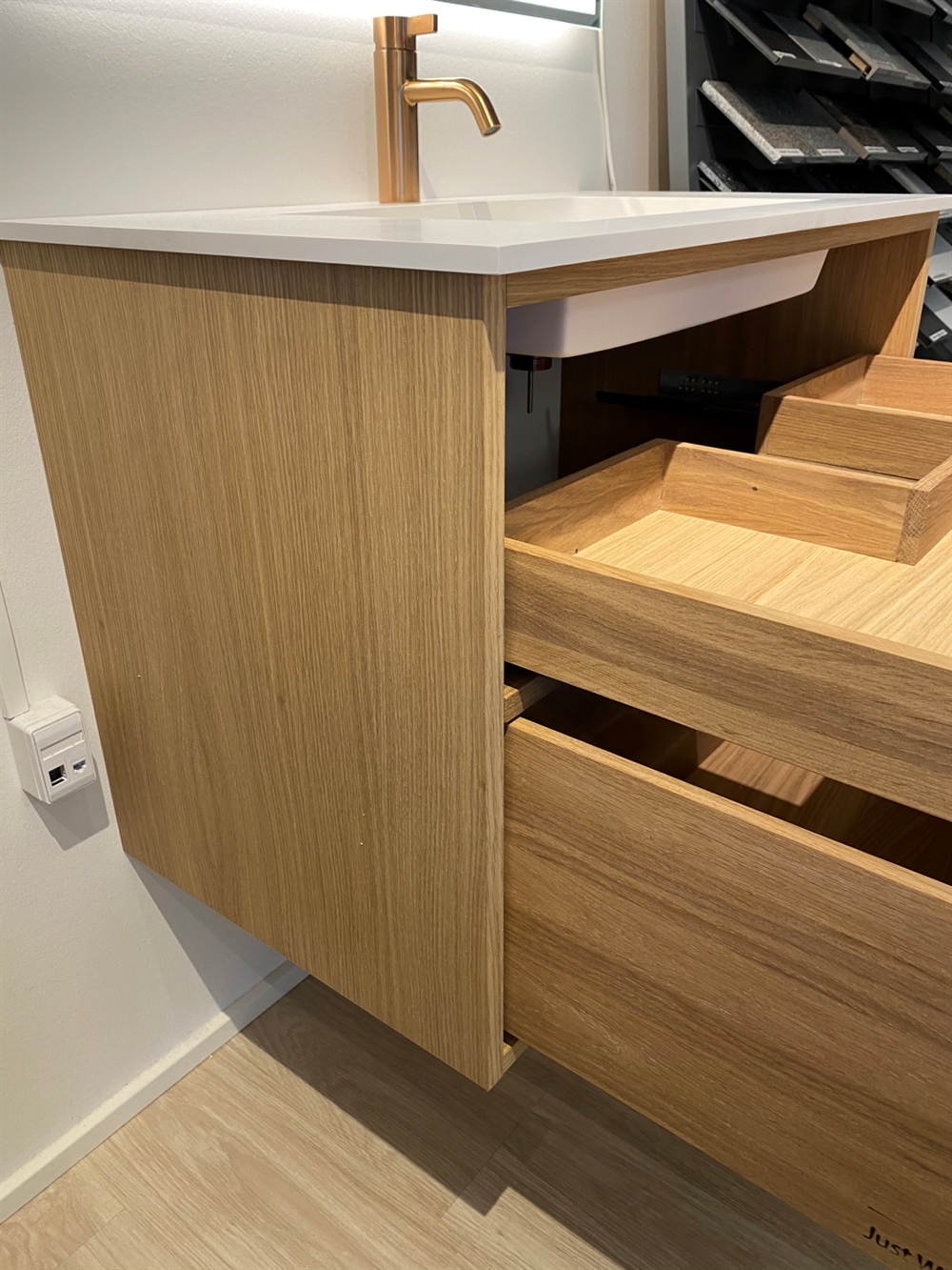Just Wood er delvist danskproducerede elementer med massive fingertappede skuffer i egetræ. Vores møbler er hvidolieret fra fabrikken. Blandingsforhold er 1 del hvid og 5 dele klar olie fra Junckers.
