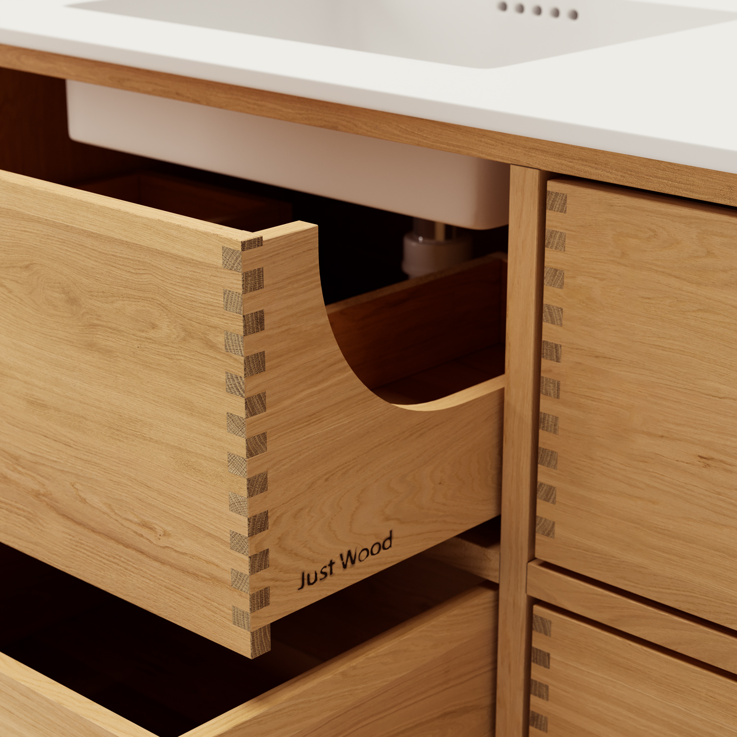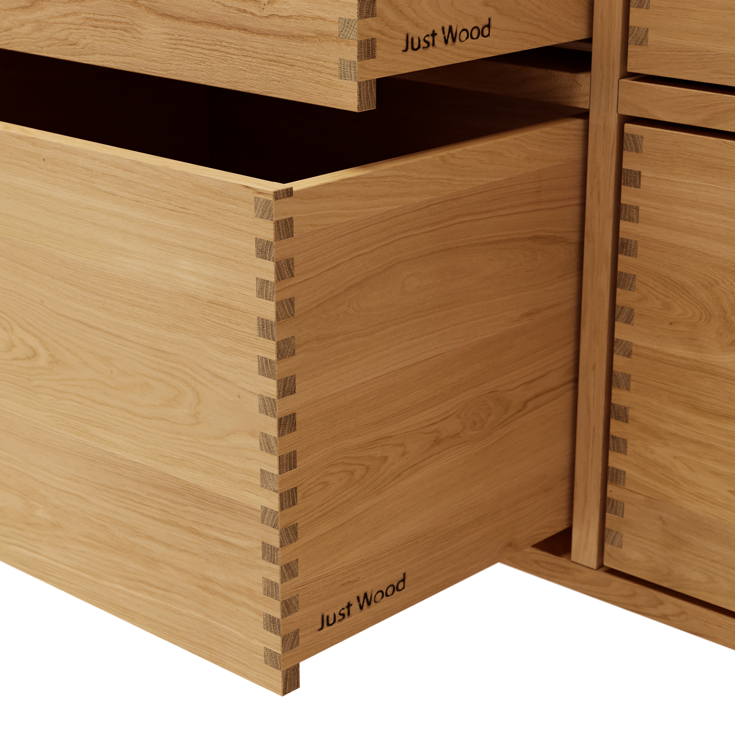 Just Wood er delvist danskproducerede elementer med massive fingertappede skuffer i egetræ. Vores møbler er hvidolieret fra fabrikken. Blandingsforhold er 1 del hvid og 5 dele klar olie fra Junckers.