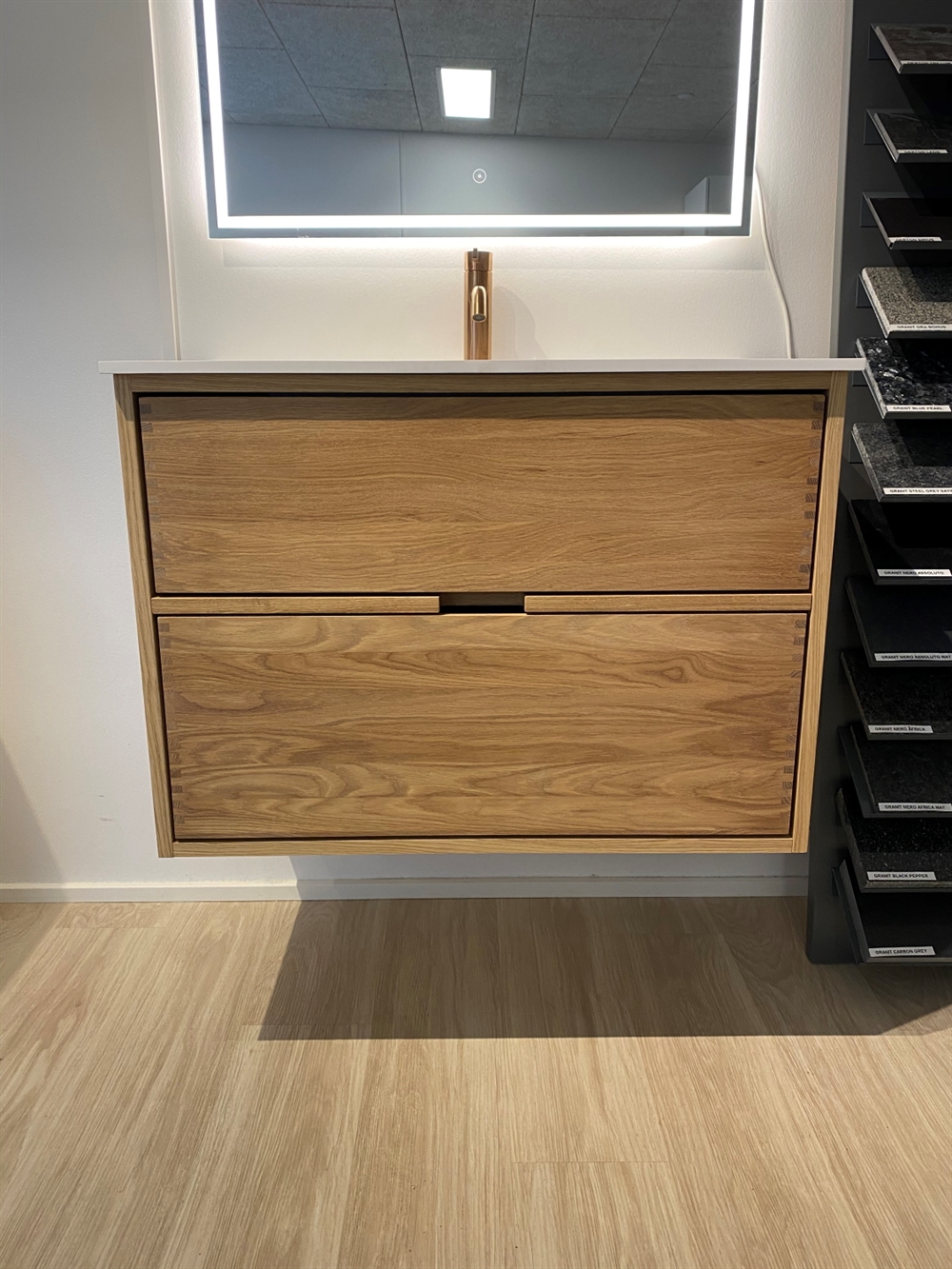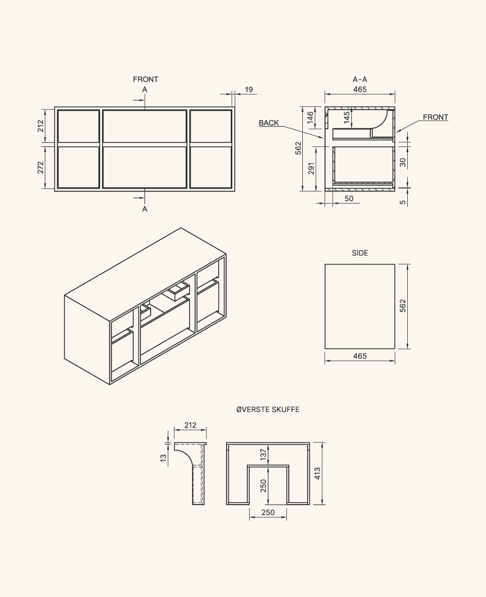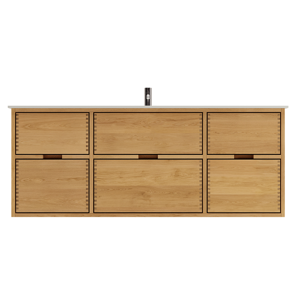 Et unikt snedkerprodukt lavet af de bedste materialer. Massive, olierede og fingertappede træskuffer i egetræ. Alle skuffer med fuldudtræk og softluk. Kraftig 8 mm. tyk bund og ekstra dybe skuffer der udnytter pladsen i skabet optimalt. Alt er lavet, så det passer perfekt sammen.
