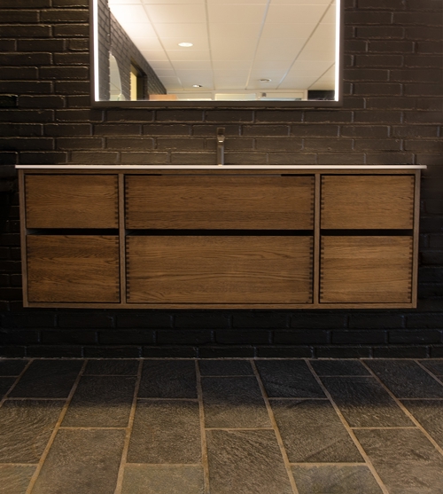 Just Wood er delvist danskproducerede elementer med massive fingertappede skuffer i egetræ. Vores møbler er mørkolieret fra fabrikken.