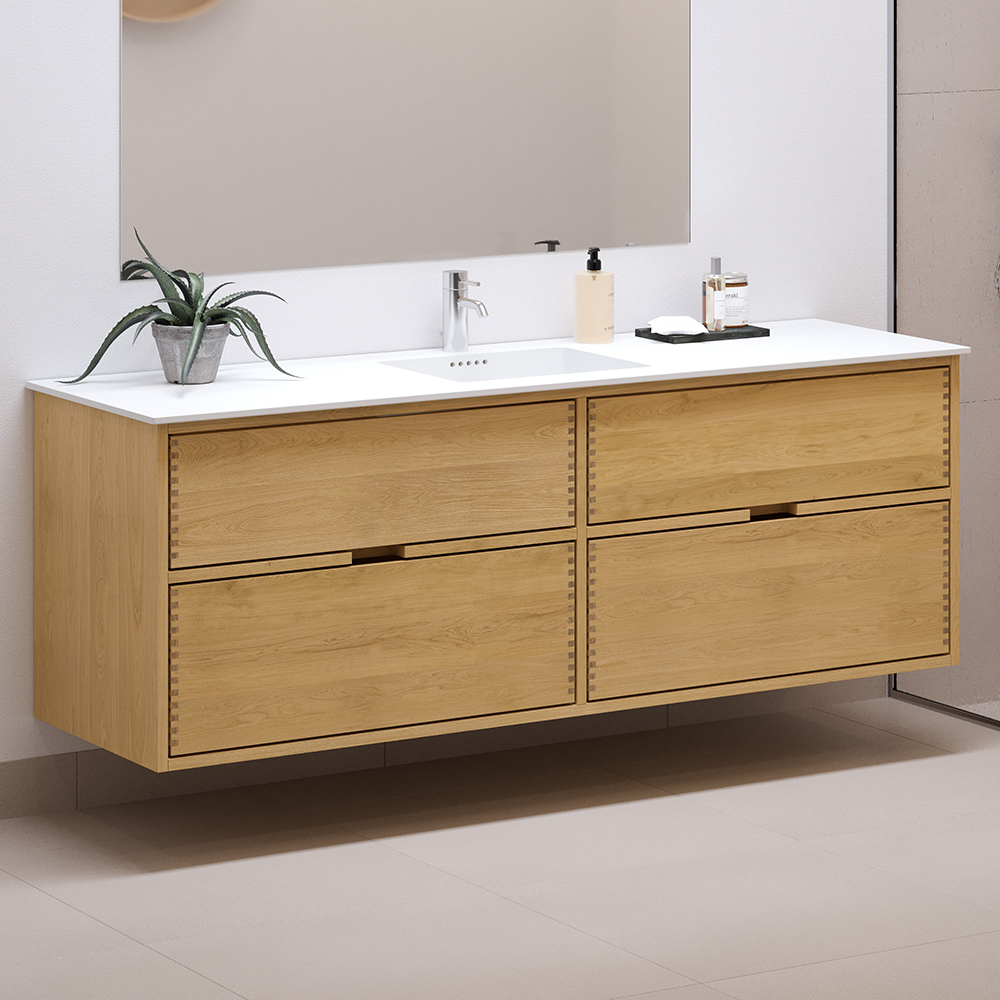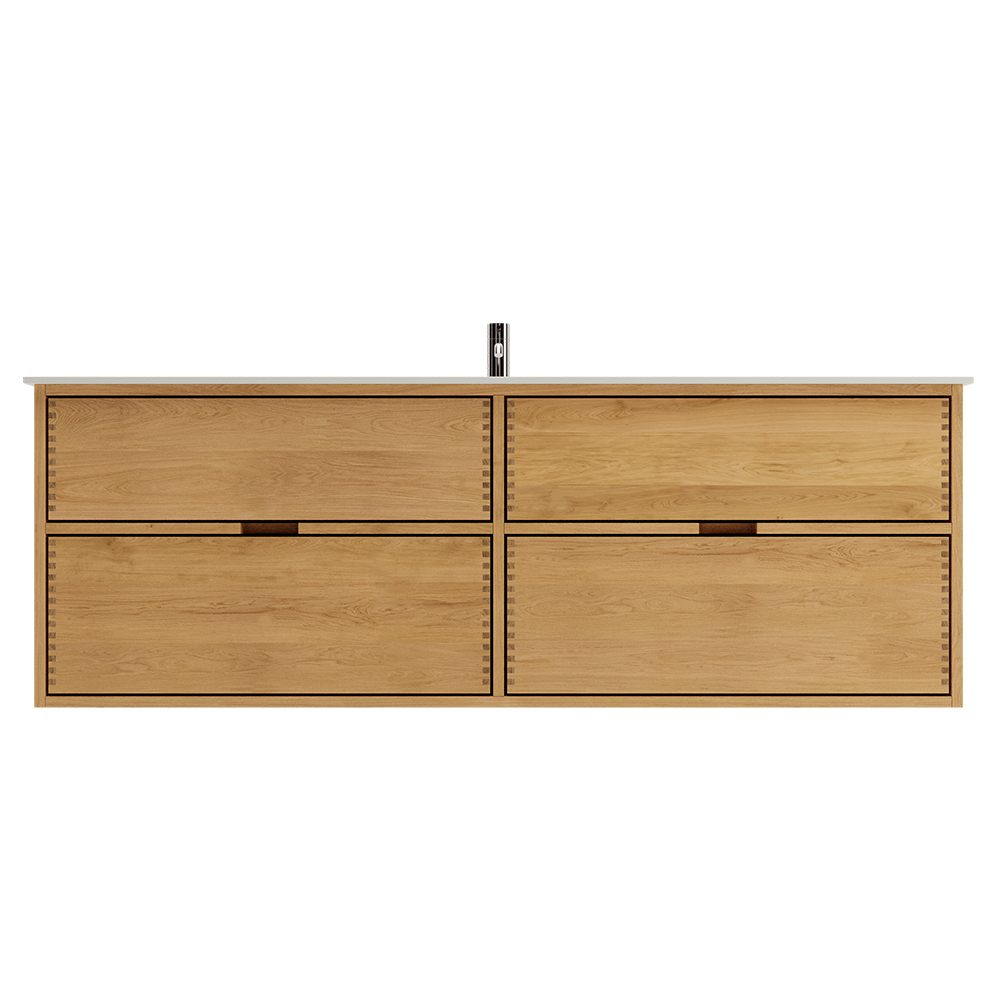 Et unikt snedkerprodukt lavet af de bedste materialer. Massive, olierede og fingertappede træskuffer i egetræ. Alle skuffer med fuldudtræk og softluk. Kraftig 8 mm. tyk bund og ekstra dybe skuffer der udnytter pladsen i skabet optimalt. Alt er lavet, så det passer perfekt sammen.
