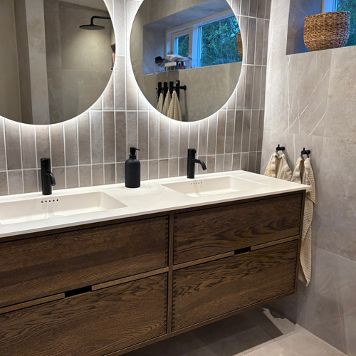 Just Wood er delvist danskproducerede elementer med massive fingertappede skuffer i egetræ. Vores møbler er hvidolieret fra fabrikken. Blandingsforhold er 1 del hvid og 5 dele klar olie fra Junckers.