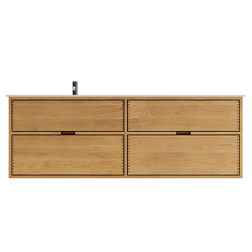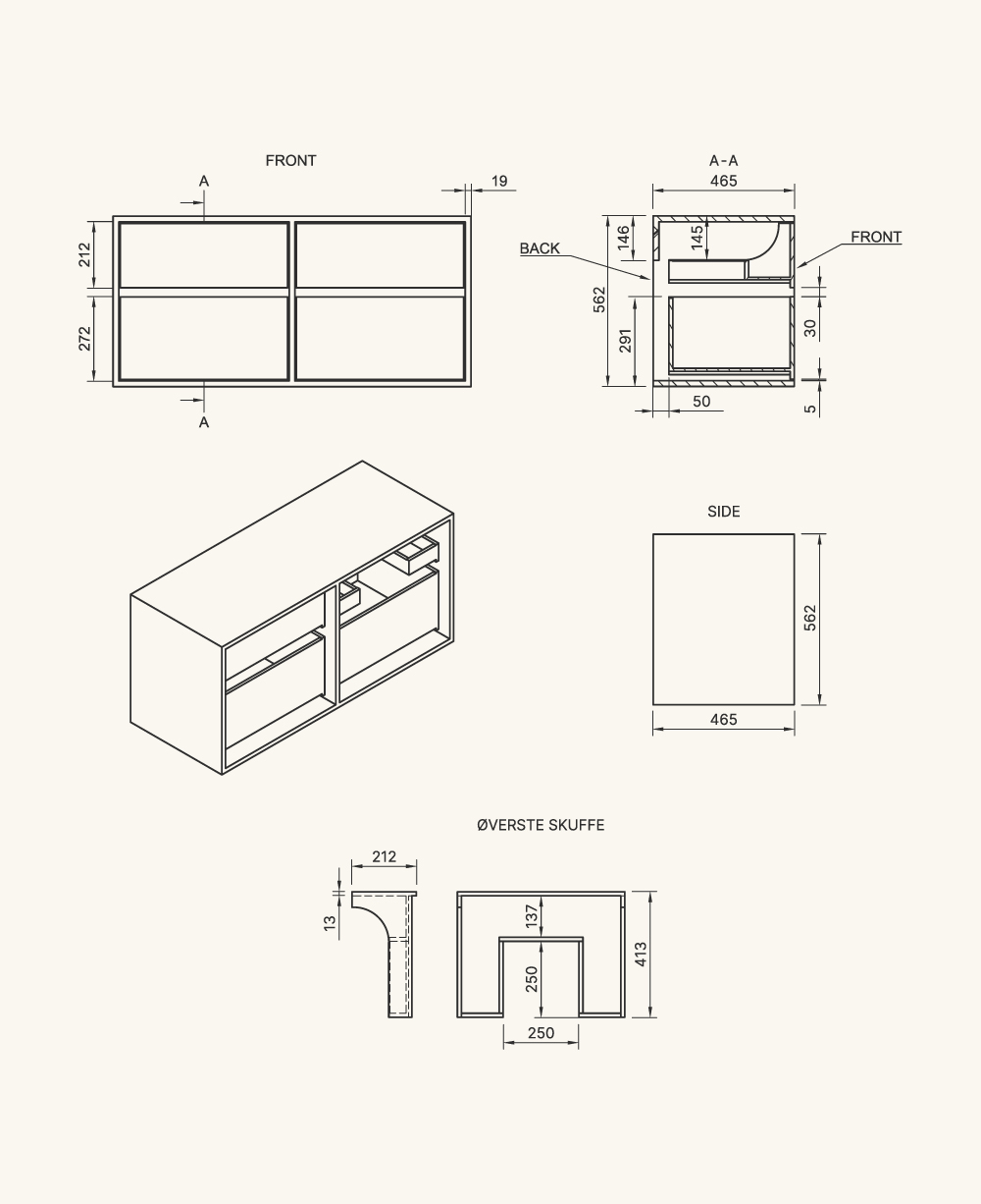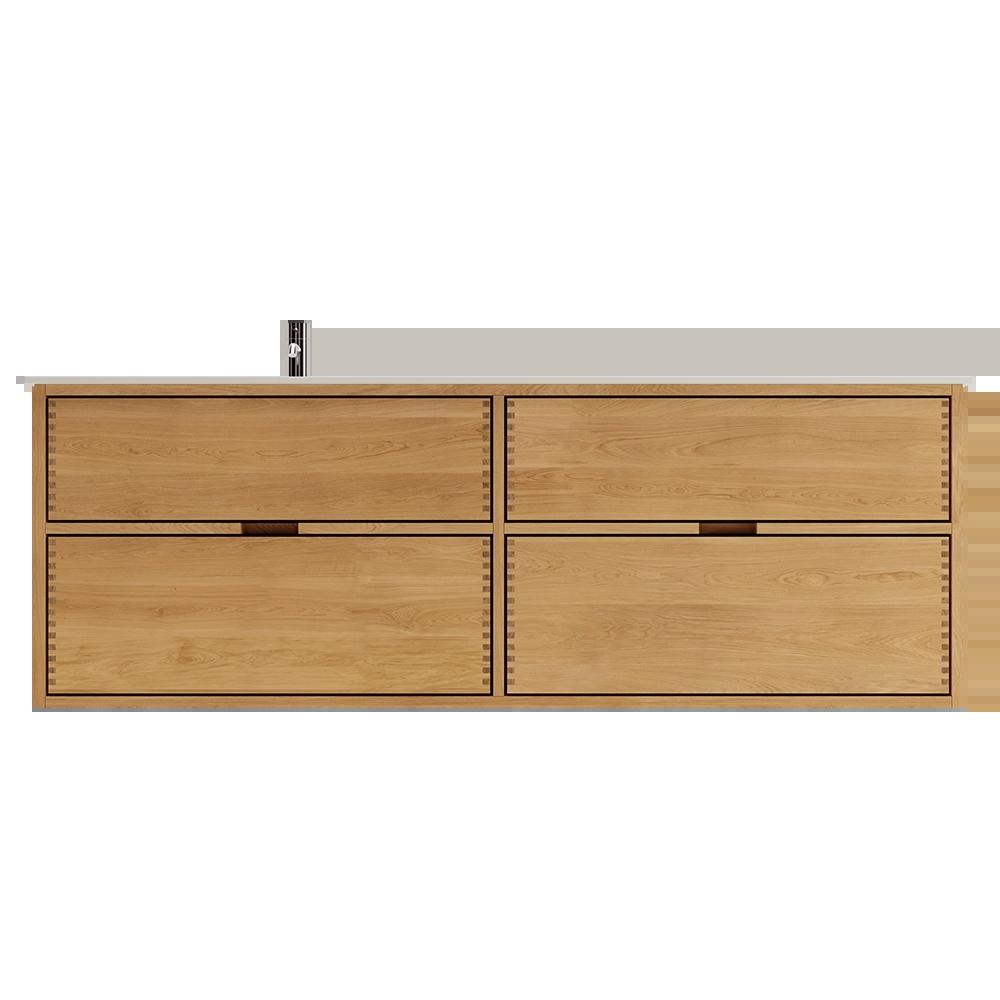 Et unikt snedkerprodukt lavet af de bedste materialer. Massive, olierede og fingertappede træskuffer i egetræ. Alle skuffer med fuldudtræk og softluk. Kraftig 8 mm. tyk bund og ekstra dybe skuffer der udnytter pladsen i skabet optimalt. Alt er lavet, så det passer perfekt sammen.