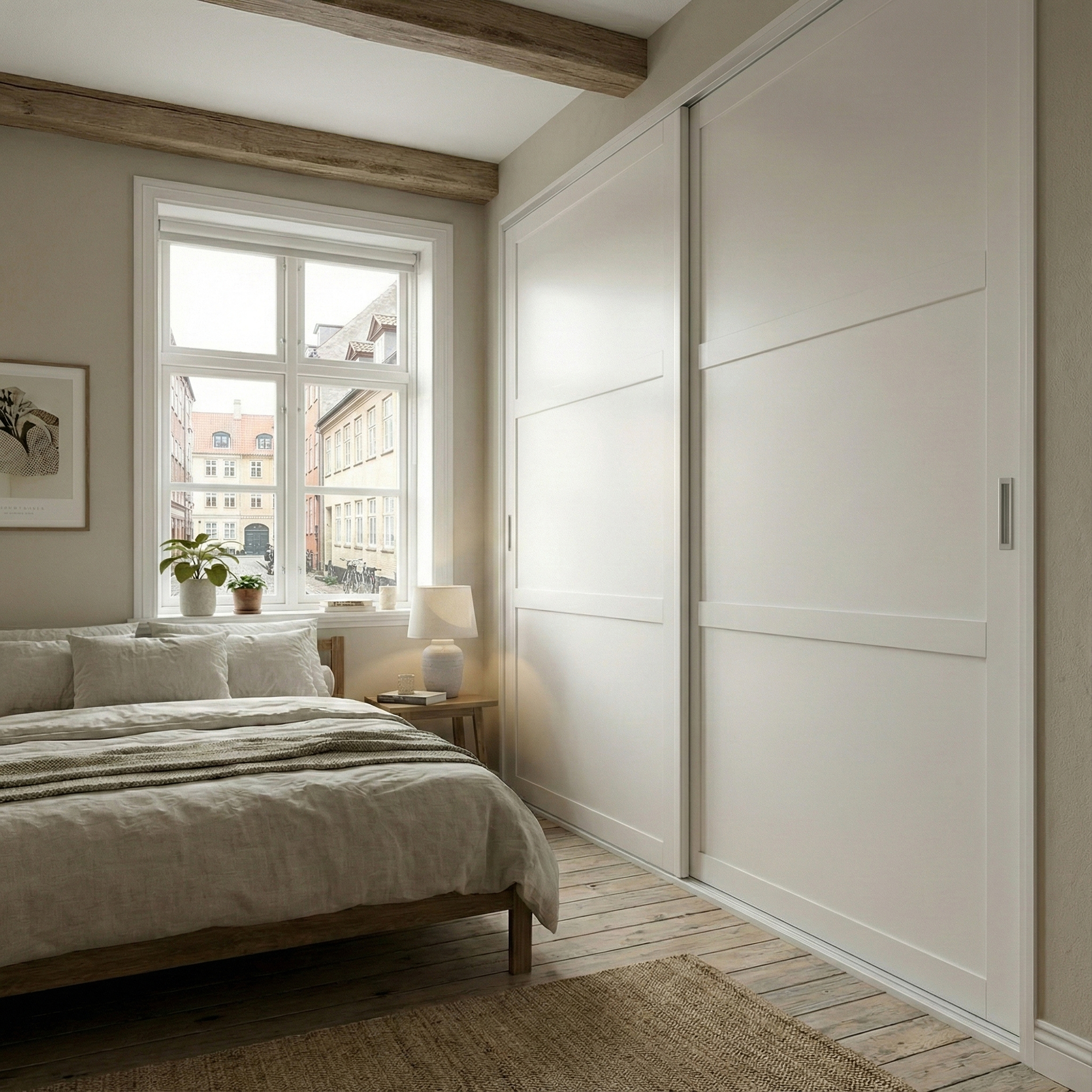 Mogensen Contoura Rammedør skydelåger på mål til garderobe med 2 låger - Total bredde 246 til 301 cm.